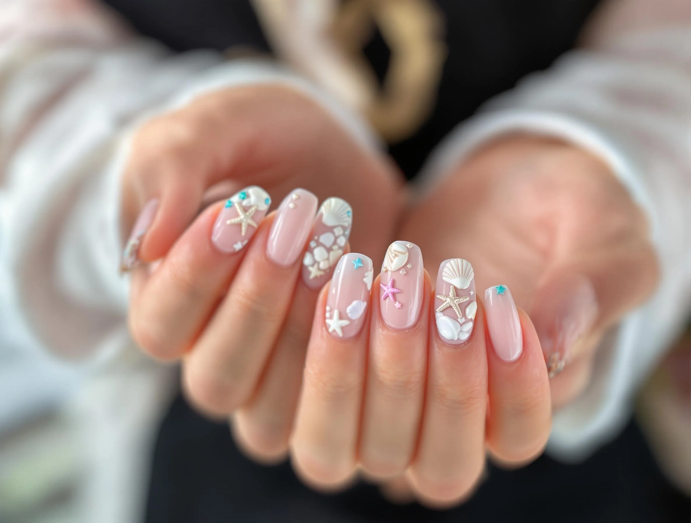 Elegant summer nail design featuring 3D seashell decorations and pastel colors on manicured hands in a professional salon setting