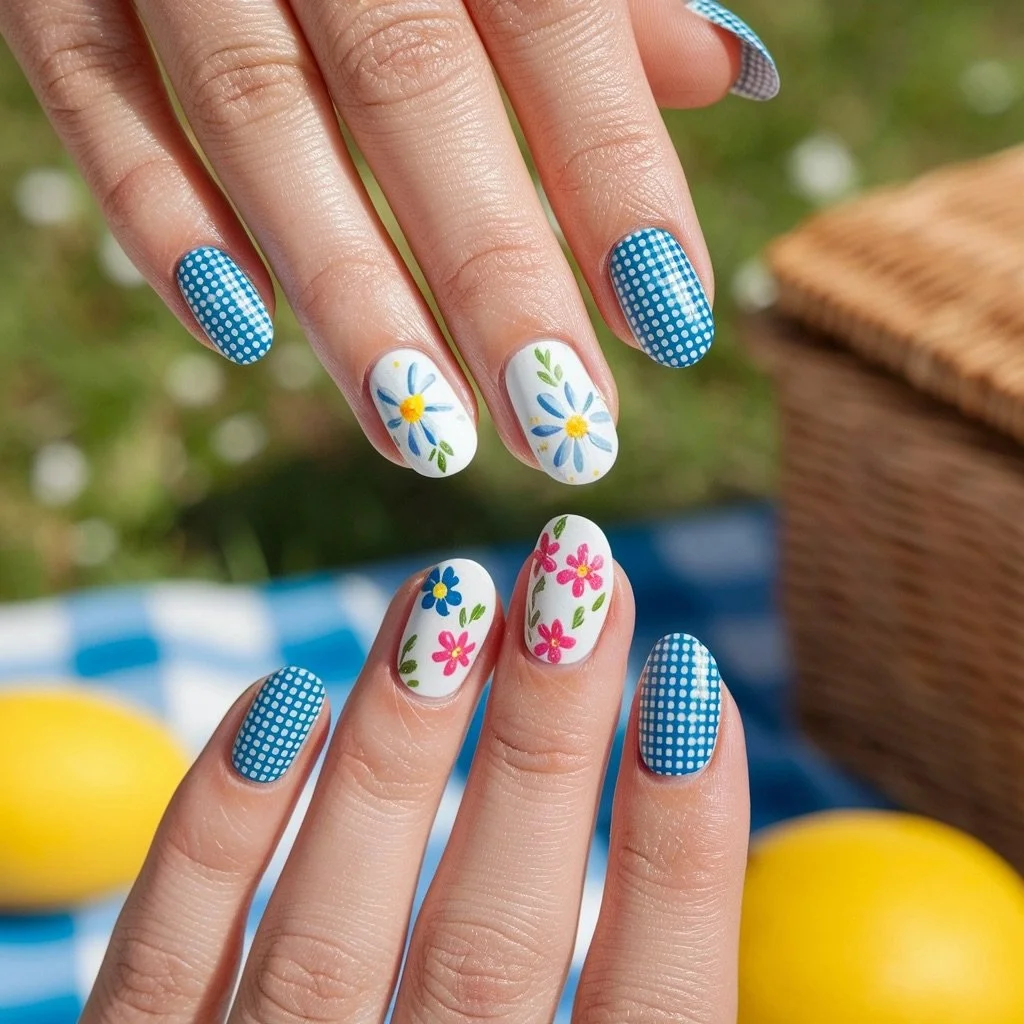 Embrace the sweetness of summer with adorable nail art! This look showcases a charming combination of blue gingham patterns and delicate white daisies with colorful centers.